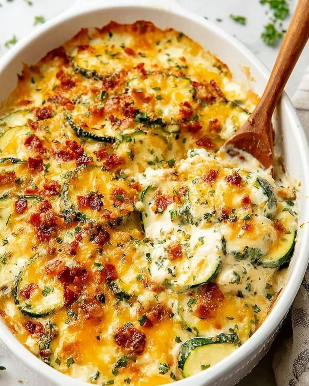 Cheesy Zucchini Gratin is a comforting and elegant side dish that turns simple zucchini into a star of the table. Baked in a creamy sauce with layers of melted cheese, it combines the tenderness of zucchini with the richness of cream and the irresistible crunch of a golden topping.