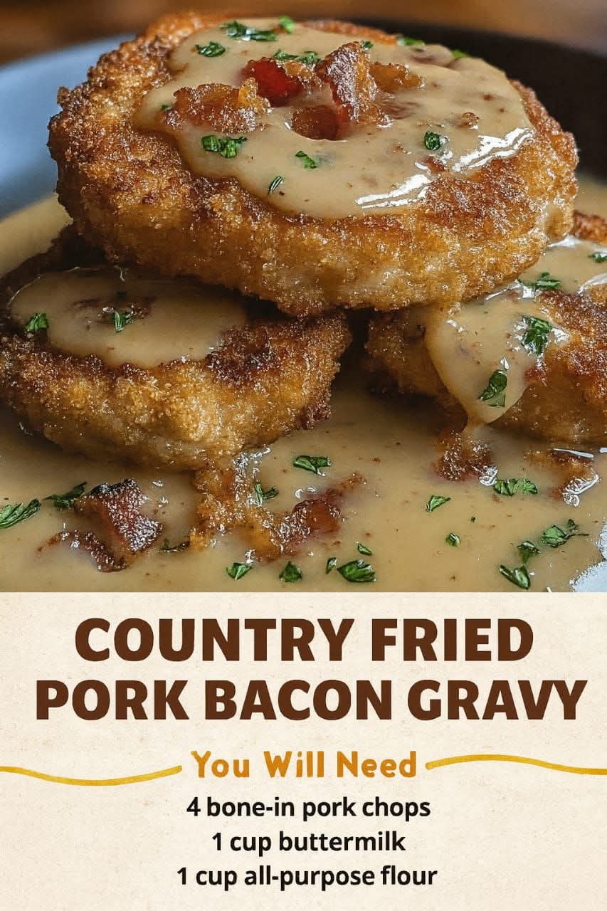 Country Fried Pork Chops with Bacon Gravy is the definition of **Southern comfort food**. With its crispy coating, juicy meat, and smoky, creamy gravy, it brings together tradition, flavor, and comfort in one dish. Whether cooked for family gatherings, romantic dinners, or holiday feasts, this meal always leaves hearts (and stomachs) full.