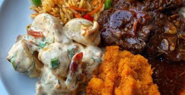 The dish in the picture is a West African-inspired mixed plate consisting of: Jollof-style fried rice with vegetables Beef in…